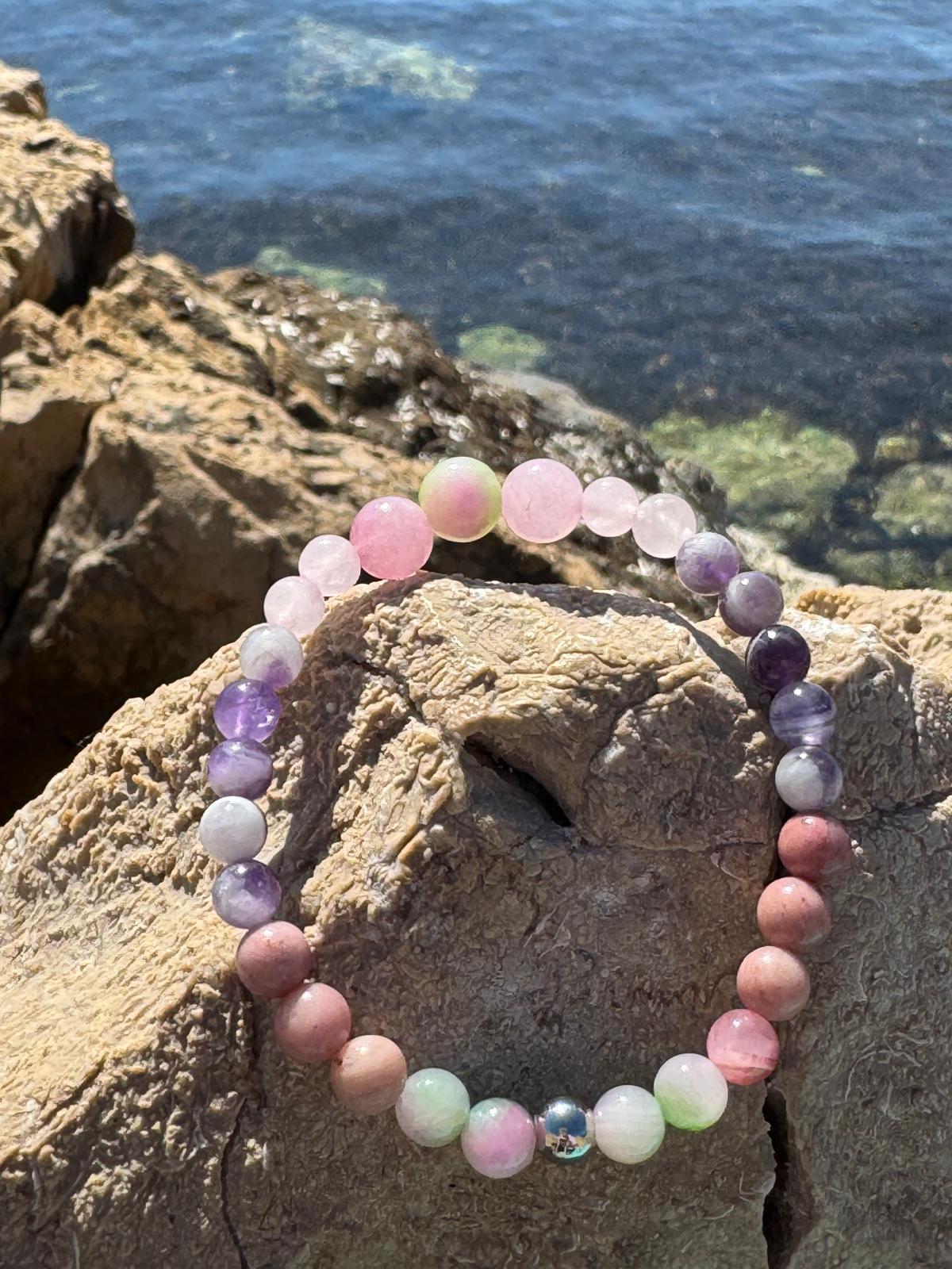 La pulsera Flor del Camí está inspirada en los caminos rurales de Menorca, adornados por flores silvestres que simbolizan amor propio, sensibilidad y belleza natural. Esta joya combina cuarzo rosa, rodonita, amatista clara y jaspe rosa para aportar dulzura y equilibrio en el camino de la vida.