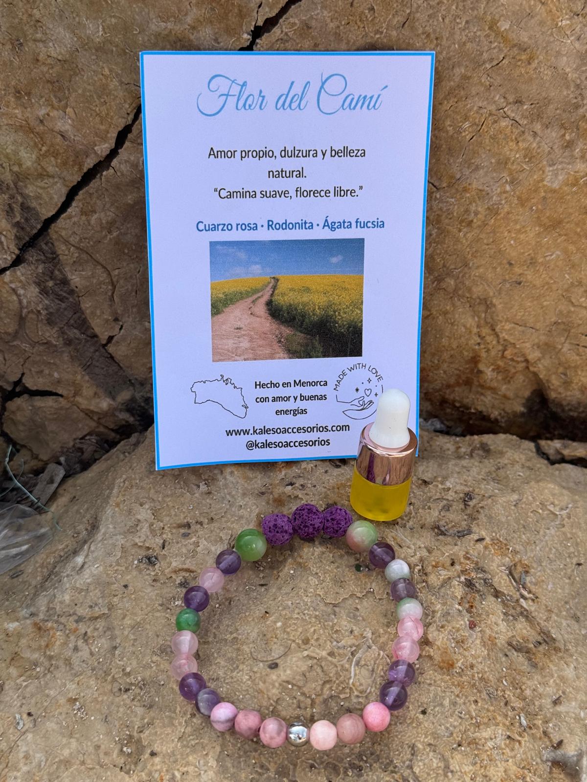 Flor del Camí evoca los caminos rurales de Menorca bordeados de flores silvestres. Con cuarzo rosa, rodonita, amatista clara y jaspe rosa. Color del cordón: rosa coral. Amor propio y dulzura en el camino.